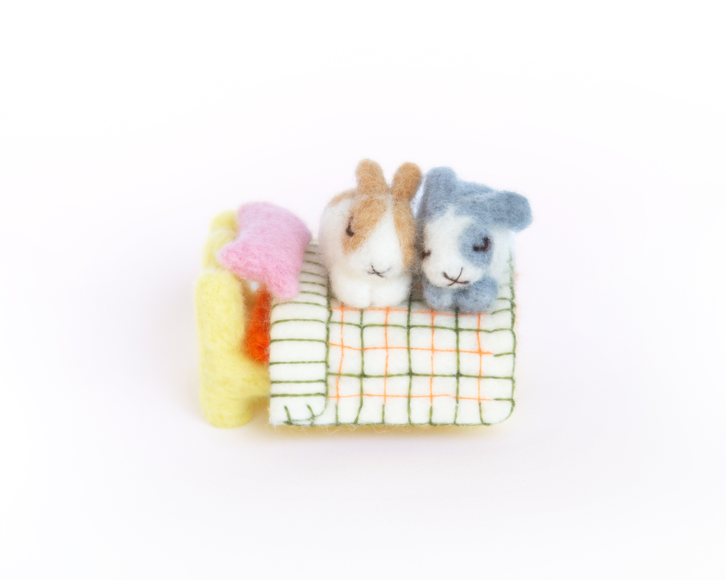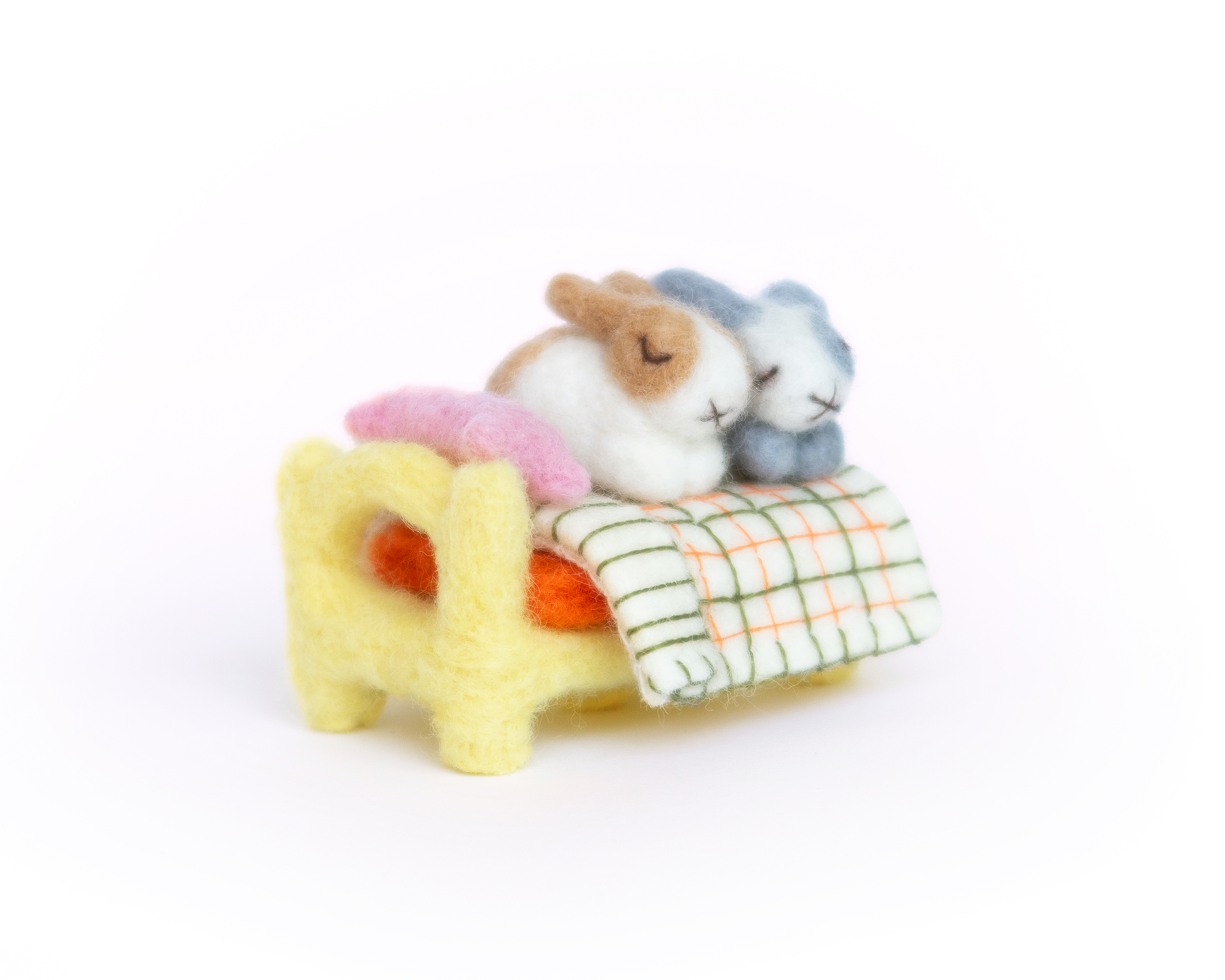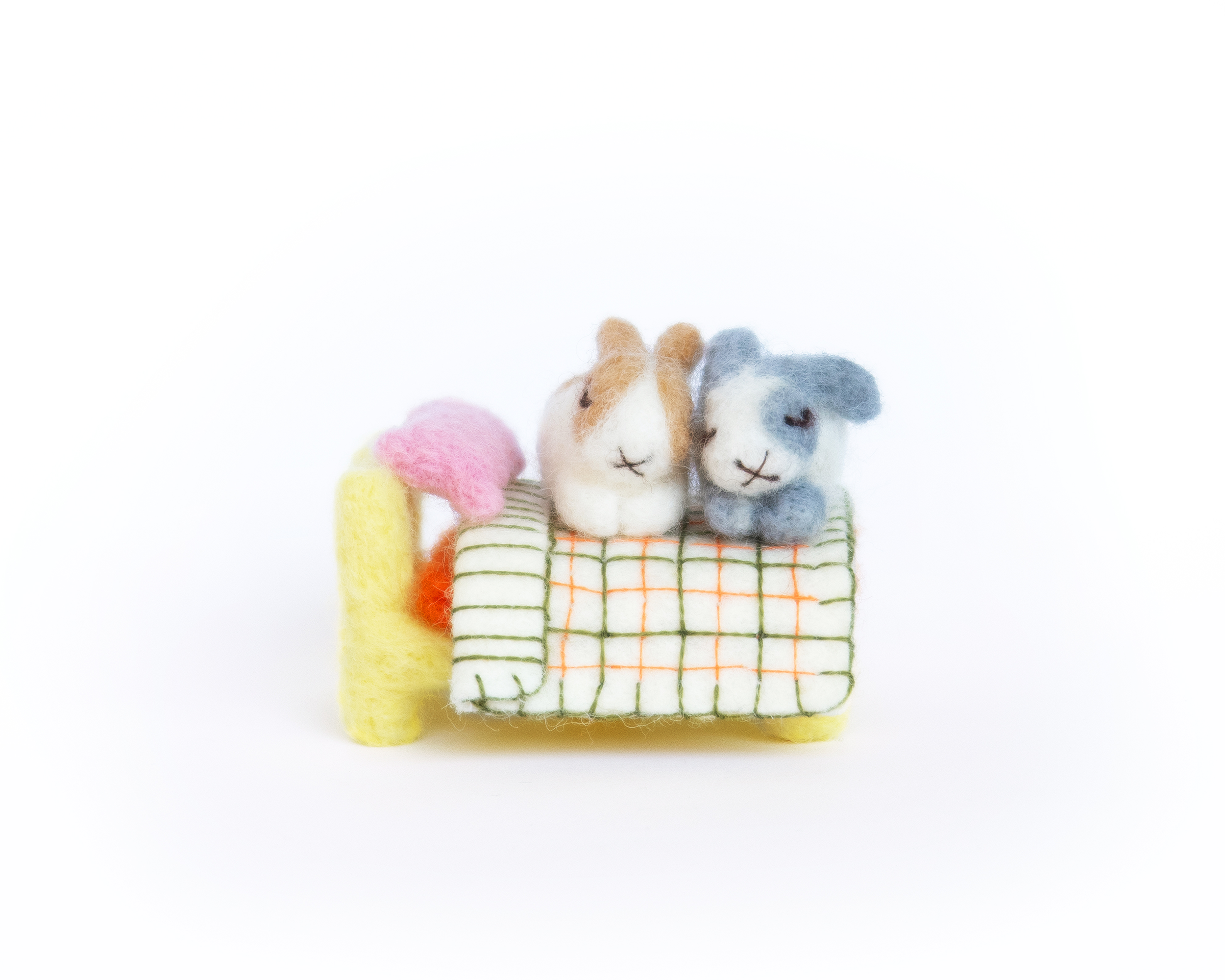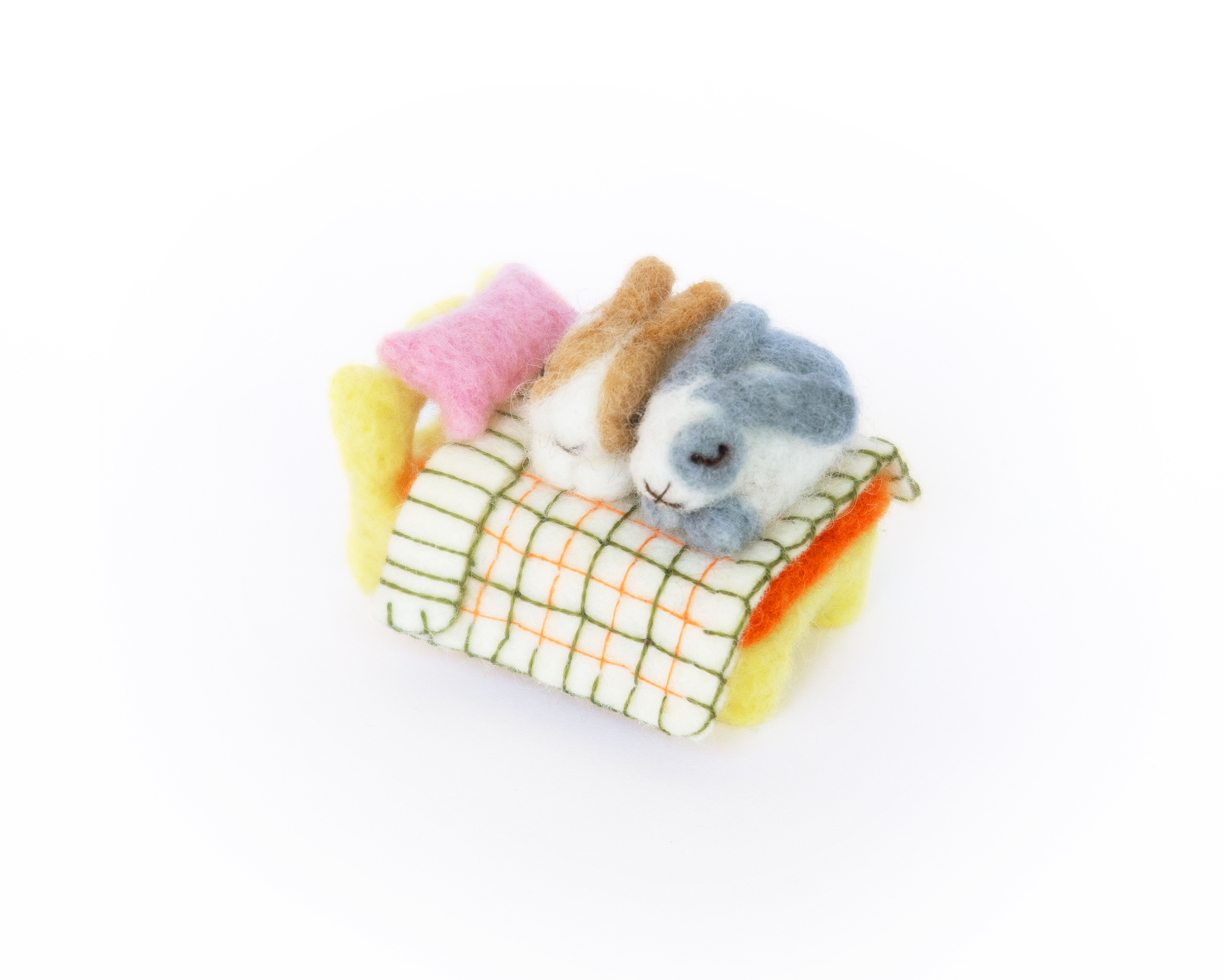 Made from 100% wool fleece and felt, these soft sculptures imagine a world of wonder, comfort and whimsy. Both delicate and vibrant, this collection of miniature felted figures are inspired by children’s play sets and the real-life personalities & behaviours of domestic rabbits.