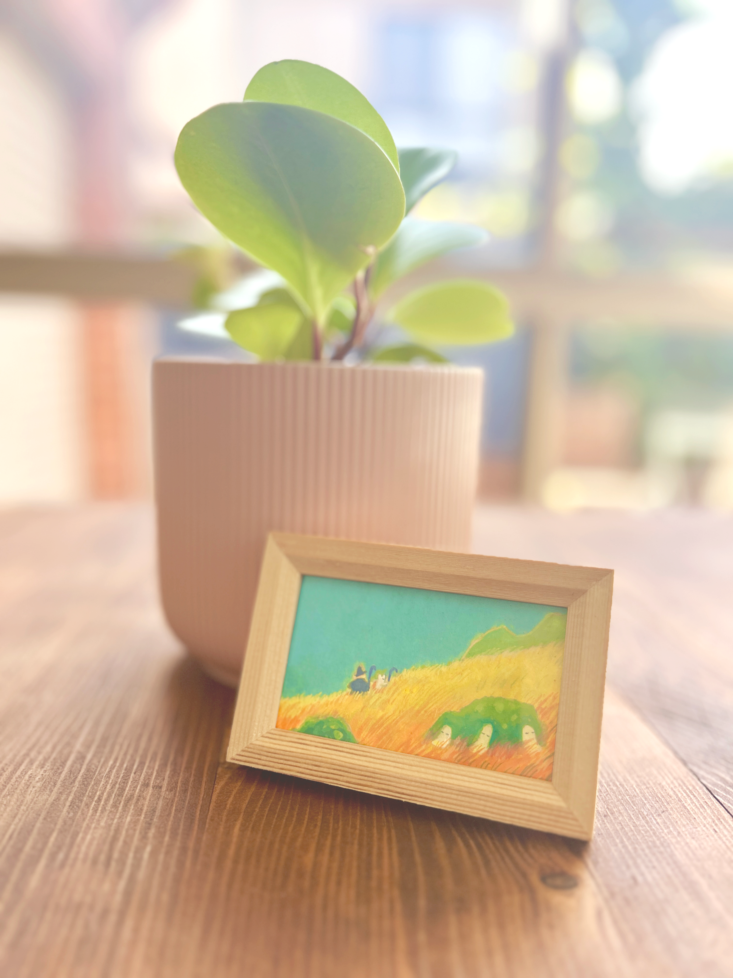 Each painting comes framed as pictured by default. If you prefer a different frame colour (walnut), please leave a note at checkout — the artist will be happy to swap it for you.